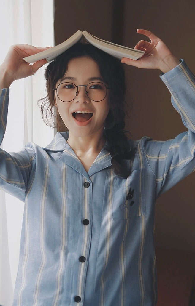 Blue Striped Cotton Couple Pajamas – Embroidered Cat Pocket Loungewear