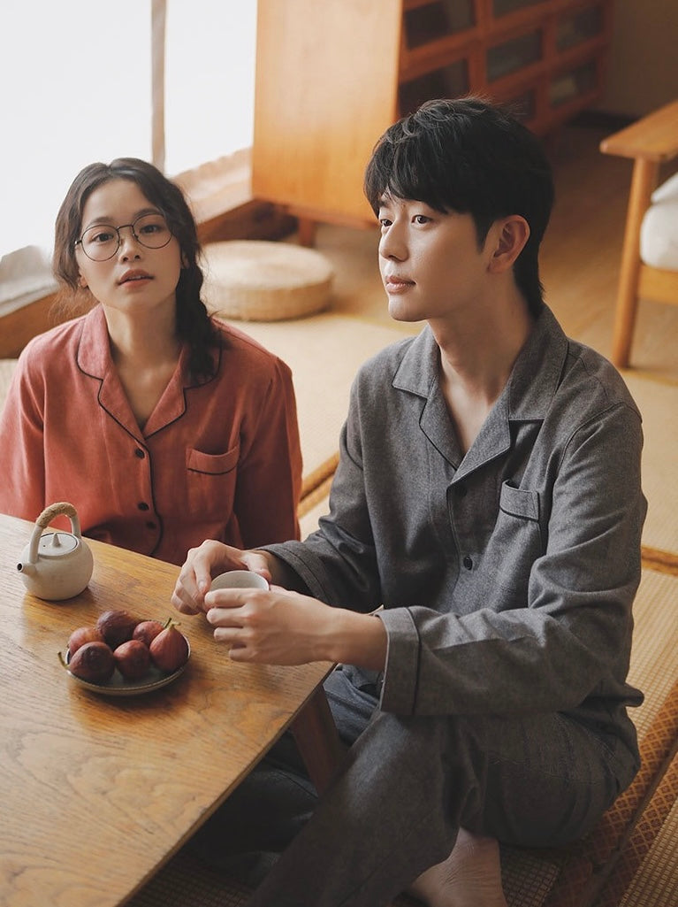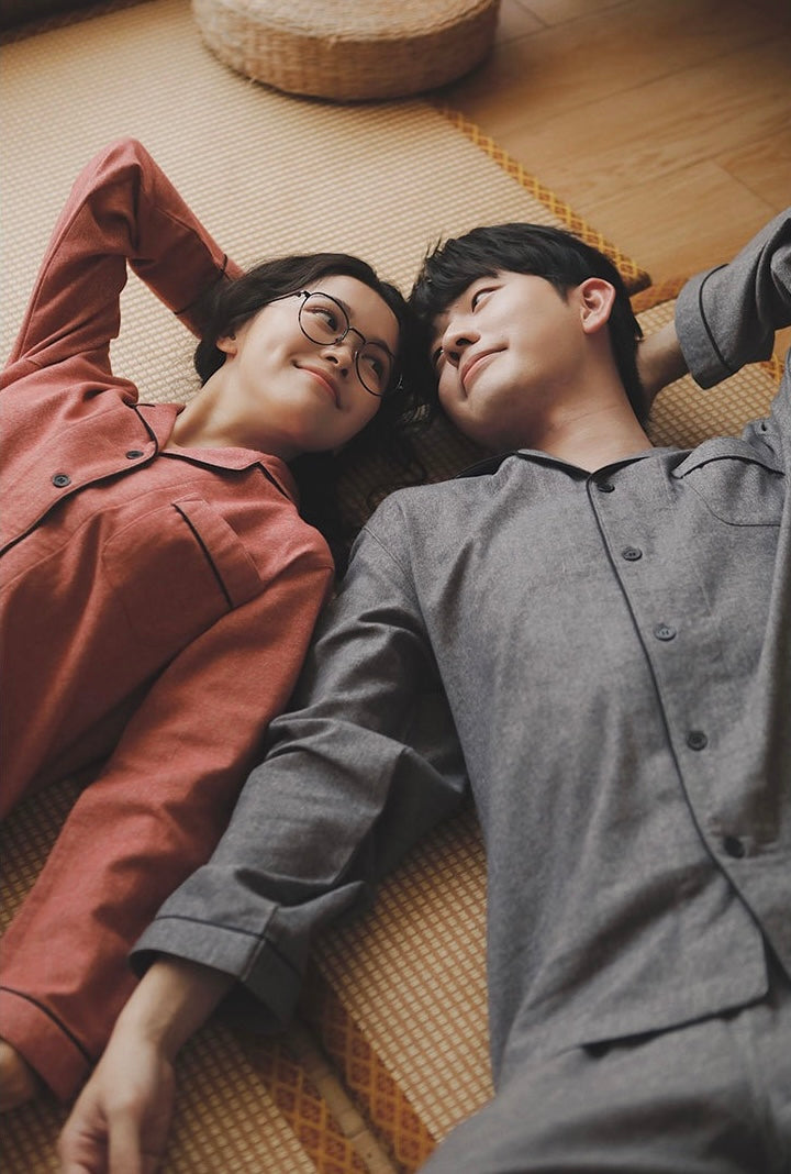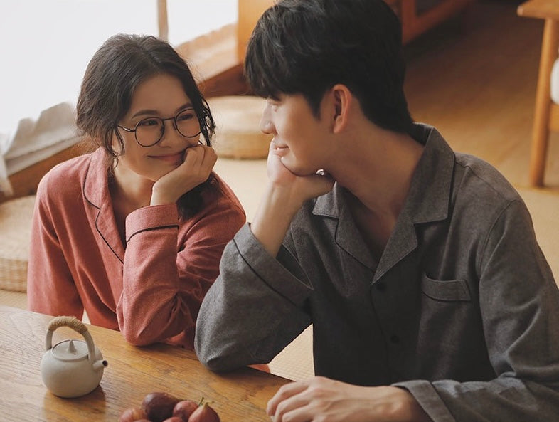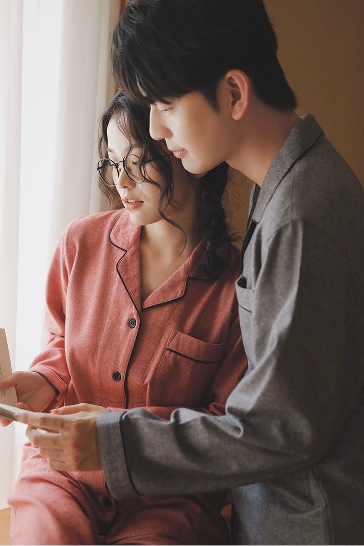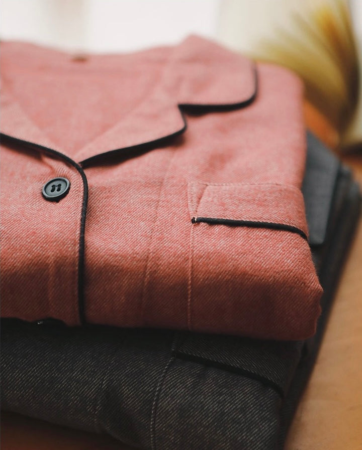 Story: Weekend light pours through the shoji-style window. You brew tea, share figs, and laugh over old stories—she in warm terracotta, he in charcoal gray. The neat piping and classic lapel make “staying in” feel a little more special, turning ordinary moments into rituals you’ll both look forward to.