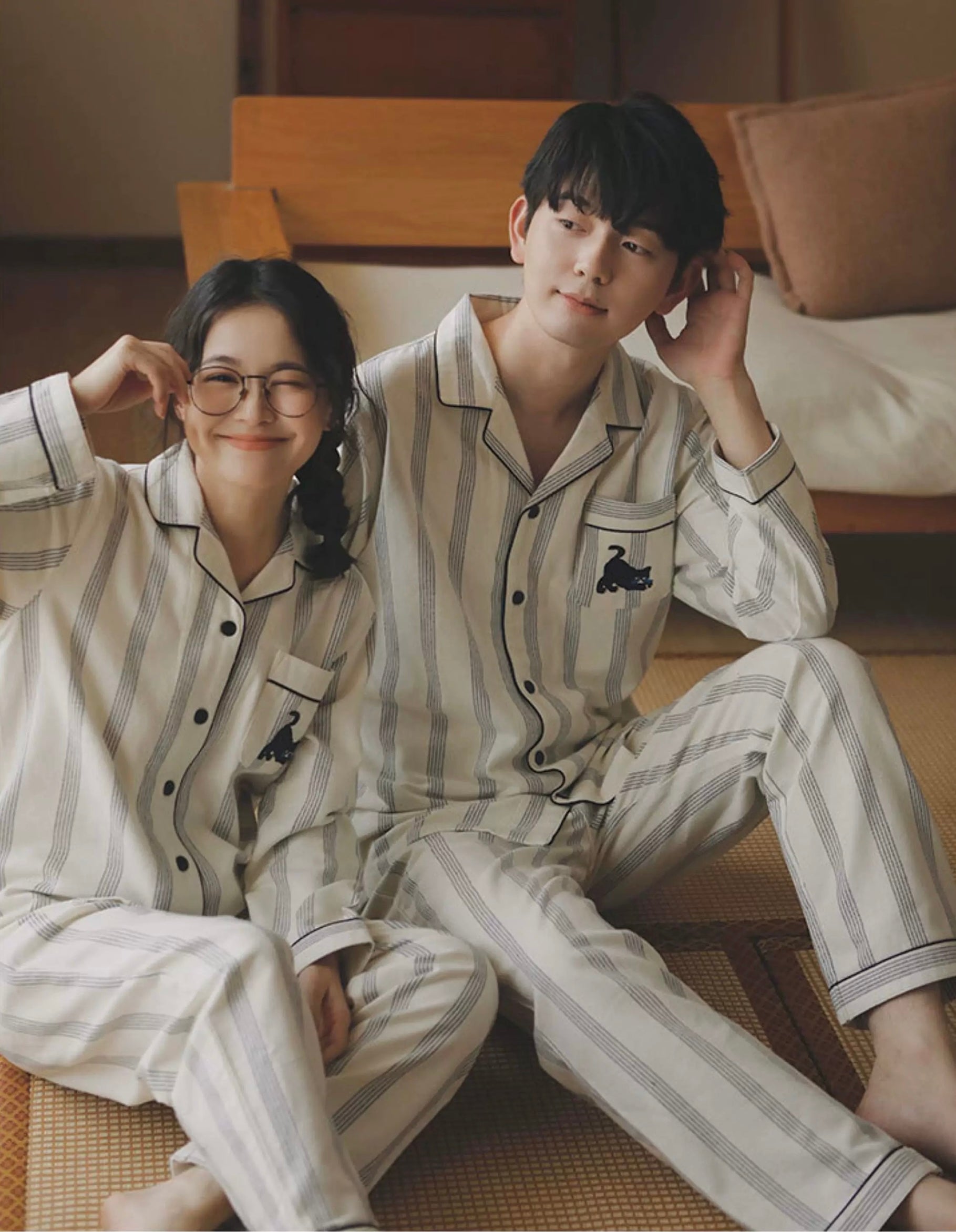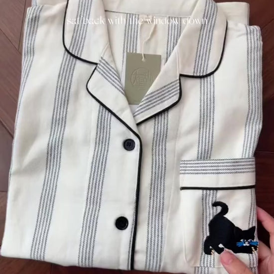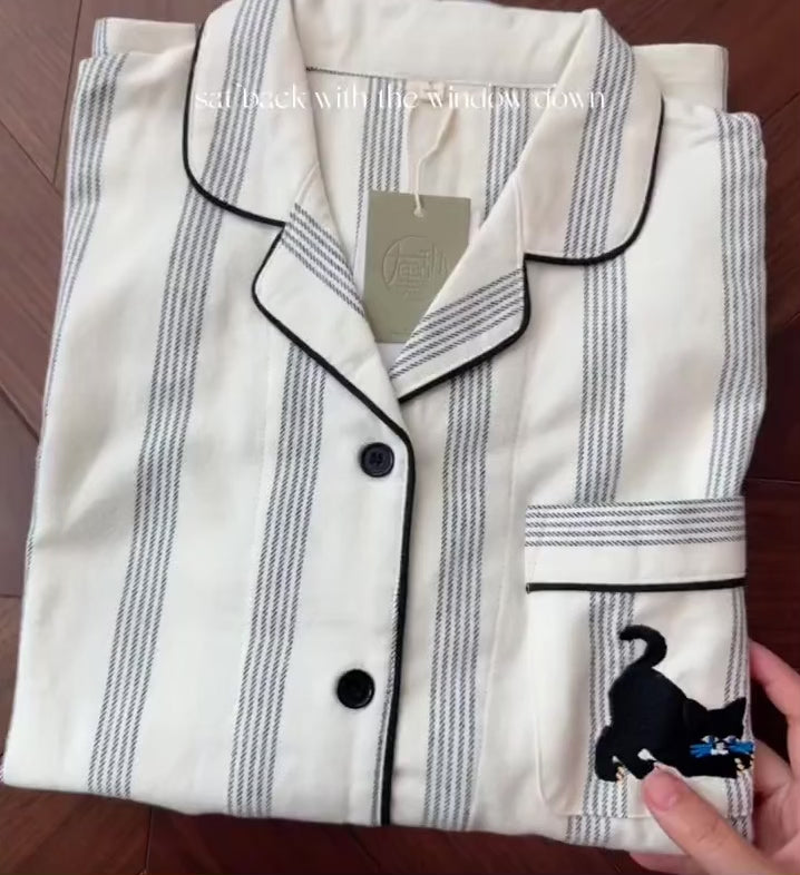 Couple Cotton Pajama Set – Striped Loungewear with Cat Embroidery