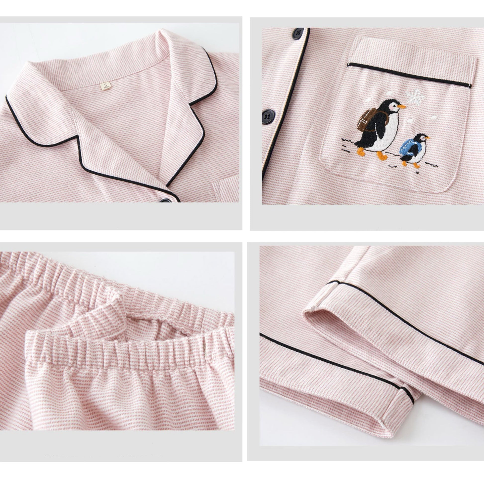 Bring warmth and love into your winter nights with this new couple’s pajama set. Made of 100% brushed cotton, it is skin-friendly, breathable, and soft to the touch. The minimalist striped pattern is elevated by adorable penguin embroidery on the chest pocket, adding a playful and cozy charm. Perfect for autumn and winter, this set combines safety-certified fabric with meticulous craftsmanship—flat seams, elastic waistband, and comfortable fit ensure both durability and all-night comfort. Ideal for couples who want to share stylish, safe, and heartwarming moments at home.